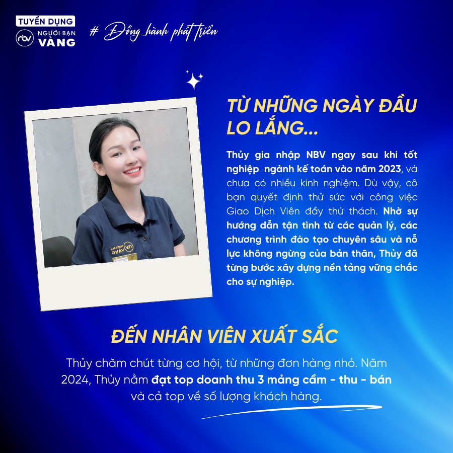 Tốt nghiệp ngành kế toán nhưng tính cách năng động, hướng ngoại, Thủy đã hạ cánh nơi Người Bạn Vàng ngay khi tốt nghiệp. Bước vào ngành dịch vụ đặc thù của NBV, Thủy không tránh khỏi sự hồi hộp và thiếu tự tin, nhất là khi chưa có nhiều kinh nghiệm thực tế.