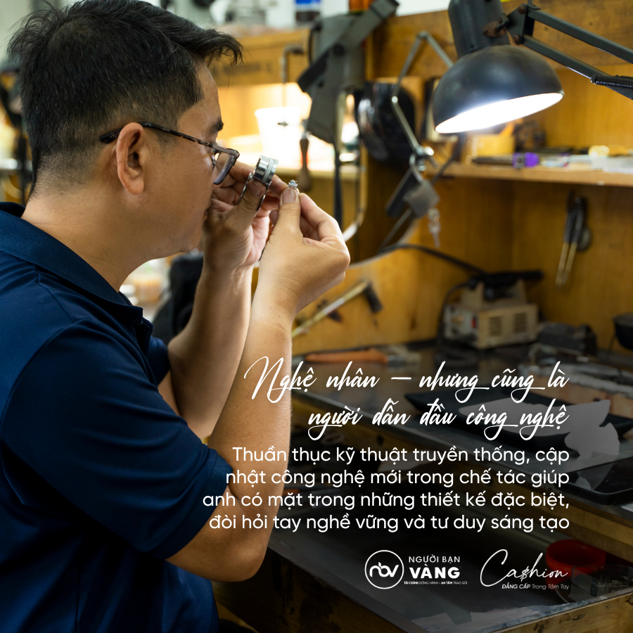 Trong đội ngũ thợ kim hoàn lành nghề tại Người Bạn Vàng, chúng tôi tự hào có anh Nguyễn Tiến Hoàng – người được phong tặng danh hiệu Nghệ nhân kim hoàn tại TP.HCM khi mới 36 tuổi – một cột mốc hiếm hoi trong giới làm nghề.