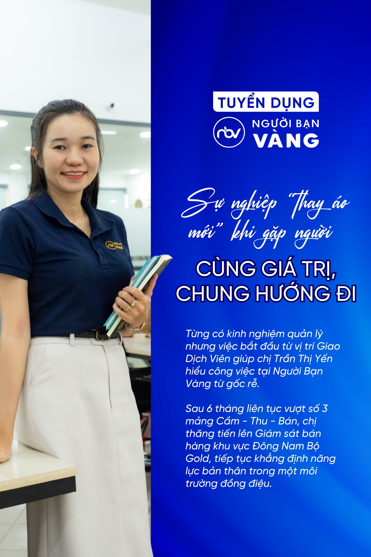 - Trần Thị Yến, từng là quản lý tại một công ty khác, chọn bắt đầu lại tại NBV từ vị trí Giao dịch viên. Mang trong mình sự đam mê, tinh thần “máu chiến” và một kế hoạch thăng tiến rõ ràng, chị từng bước khẳng định bản thân và hiện đang giữ vị trí Giám sát Bán hàng.