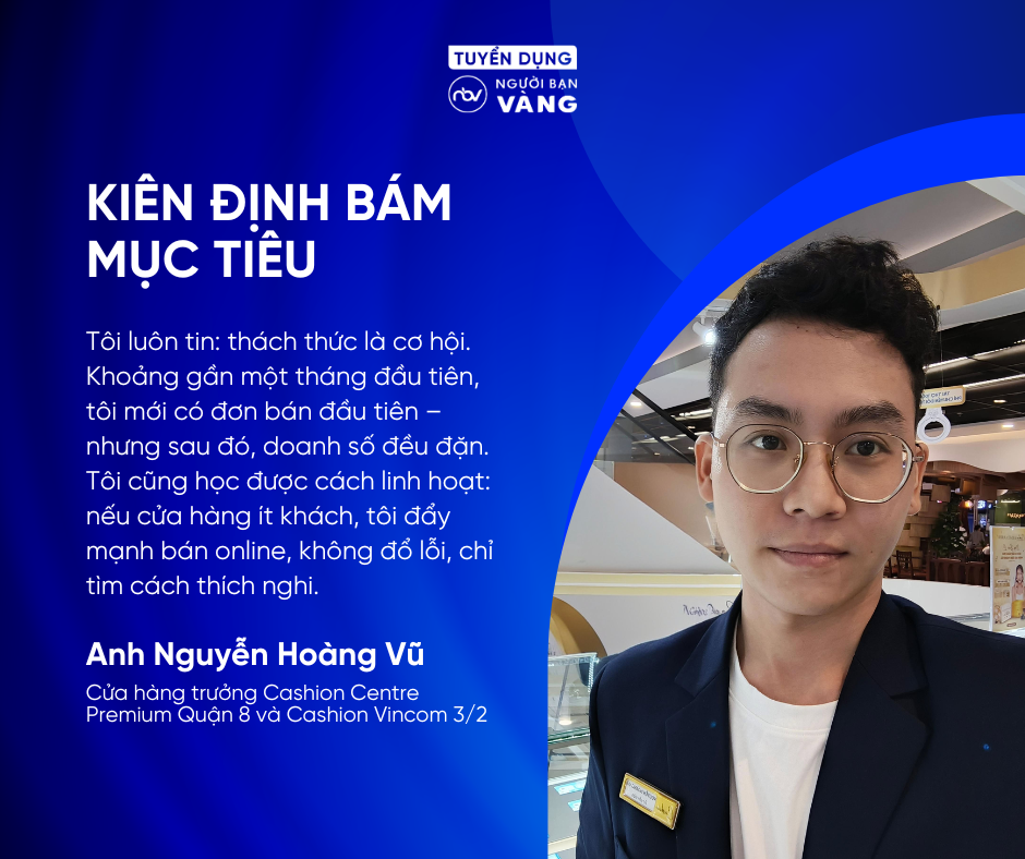 - Nguyễn Hoàng Vũ, xuất phát điểm là sinh viên ngành Công nghệ Sinh học, từng bước khẳng định phong độ từ những tháng đầu gia nhập. Đến tháng 4/2025, anh chính thức đảm nhận vai trò Cửa hàng trưởng tại hai chi nhánh Cashion Centre Premium Quận 8 và Cashion Vincom 3/2.